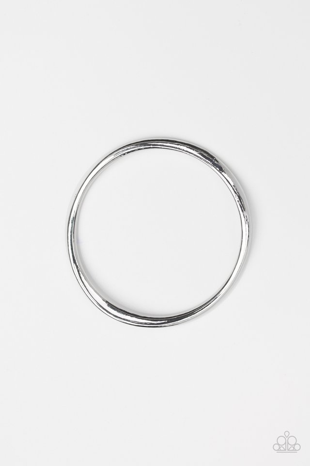 Featuring a warped surface, an asymmetrical shiny silver bangle slides along the wrist for an edgy look. Sold as one individual bracelet.