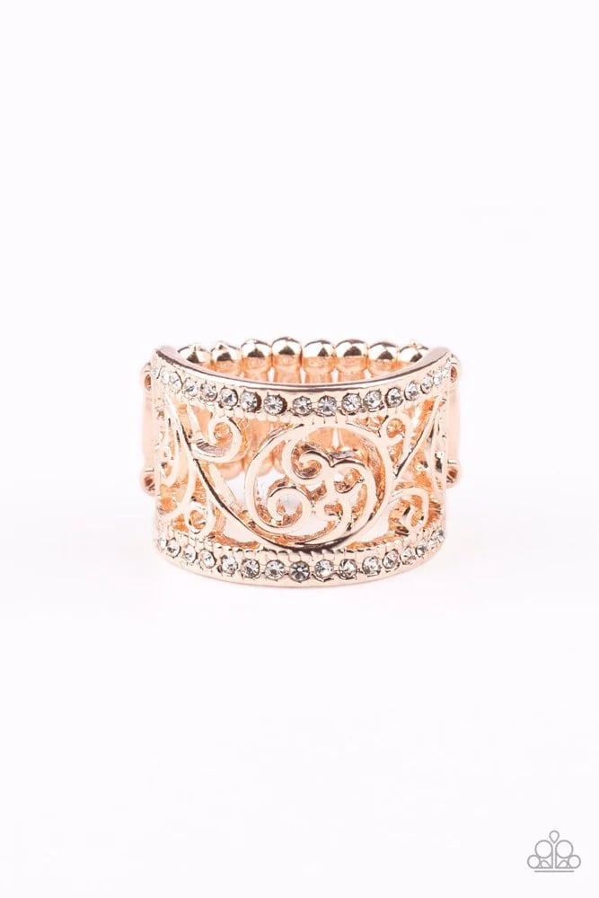 Flanked by stacks of white rhinestones, rose gold filigree race down the center of the band for a knockout finish.