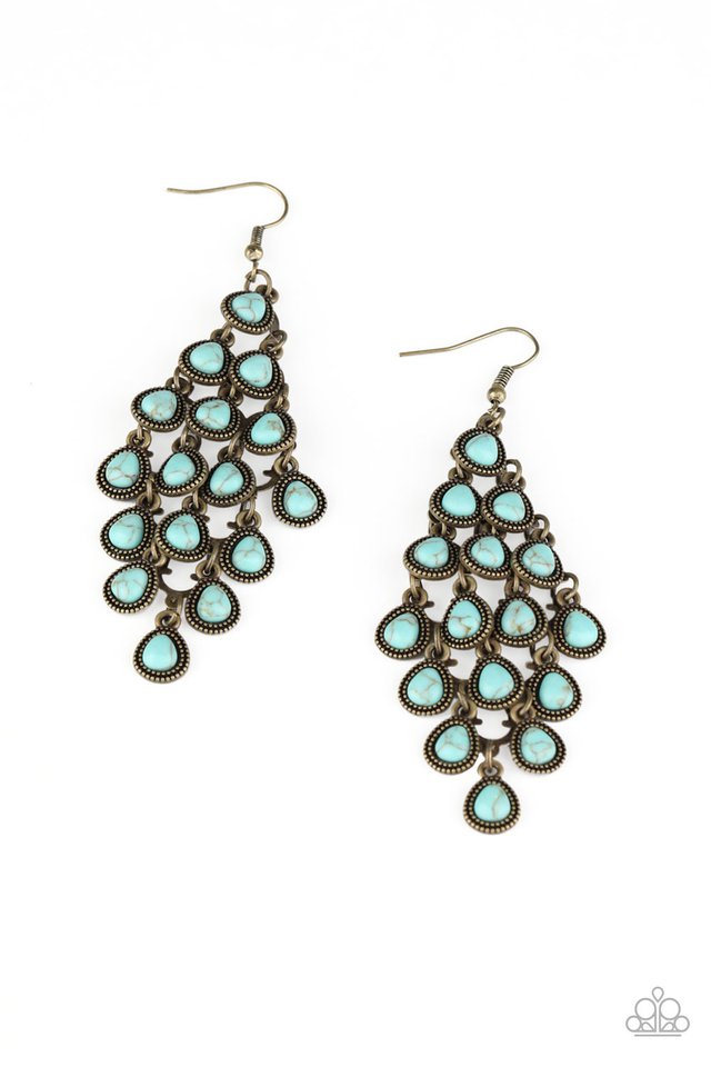 Featuring studded brass frames, dainty turquoise teardrops cascade from the ear. The earthy frames dangle from a netted backdrop, coalescing into a rustic lure. Earring attaches to a standard fishhook fitting. Sold as one pair of earrings.