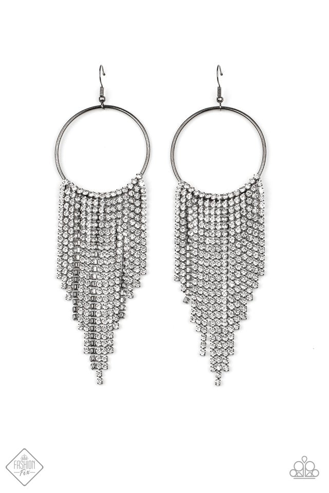 Tapered rows of glittery white rhinestones cascade from the bottom of a shiny gunmetal hoop, creating a glamorously glitzy fringe. Earring attaches to a standard fishhook fitting. Sold as one pair of earrings.